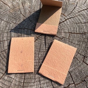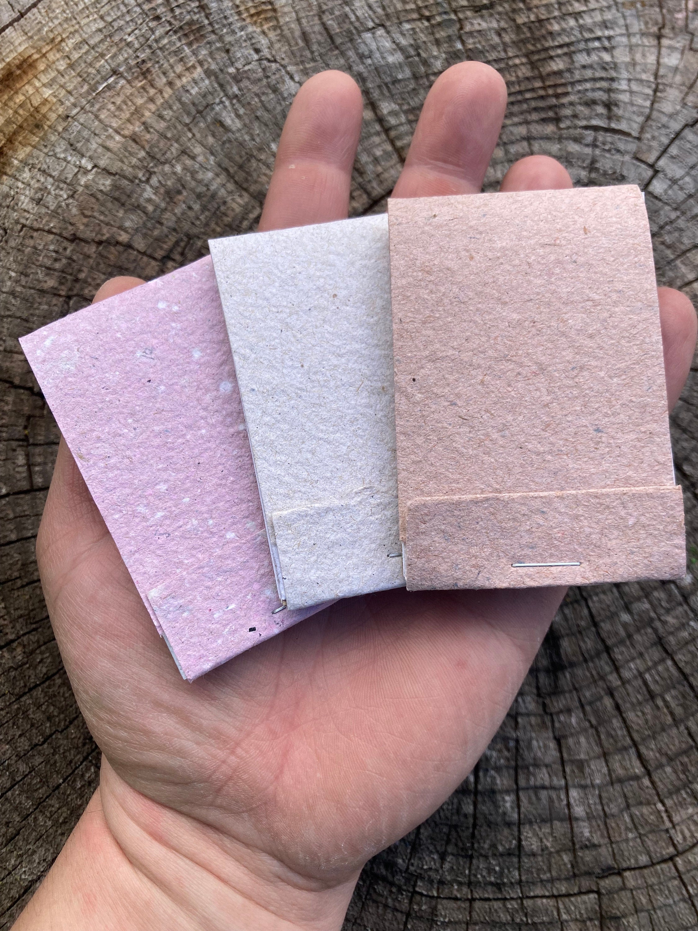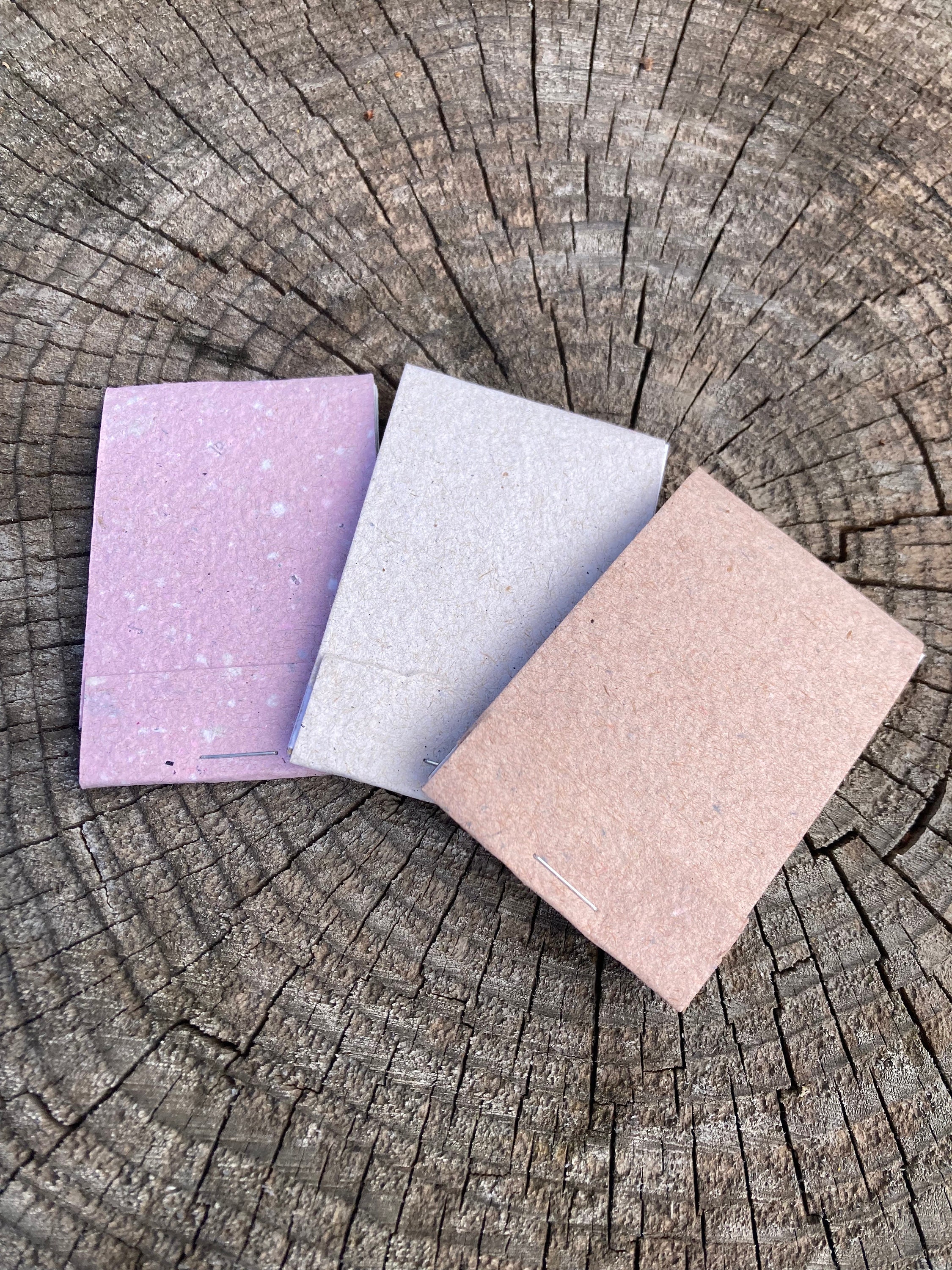 This listing is for a set of three 2x3 inch matchbook notebooks with assorted pink covers, and pages in assorted neutral colors.