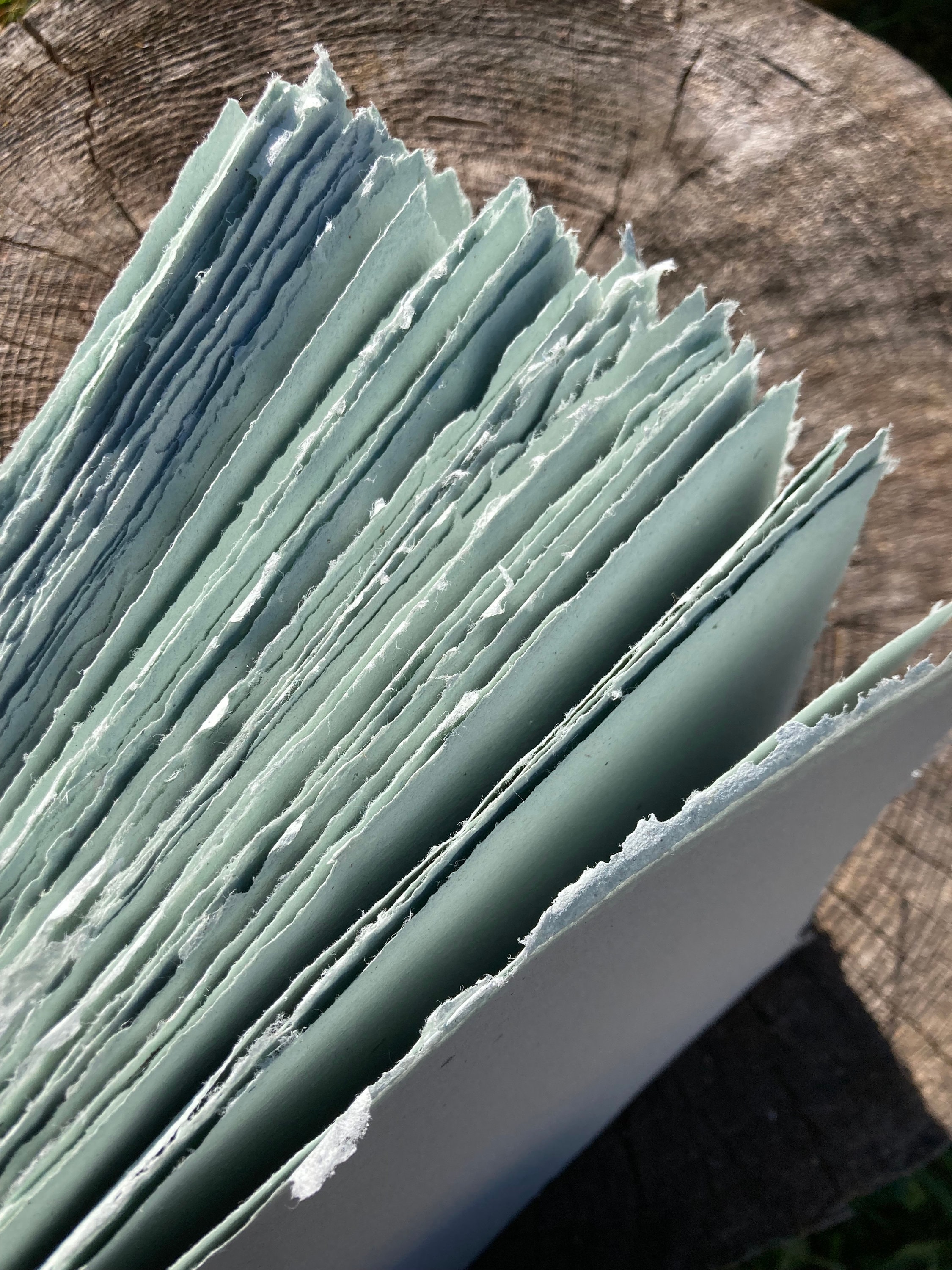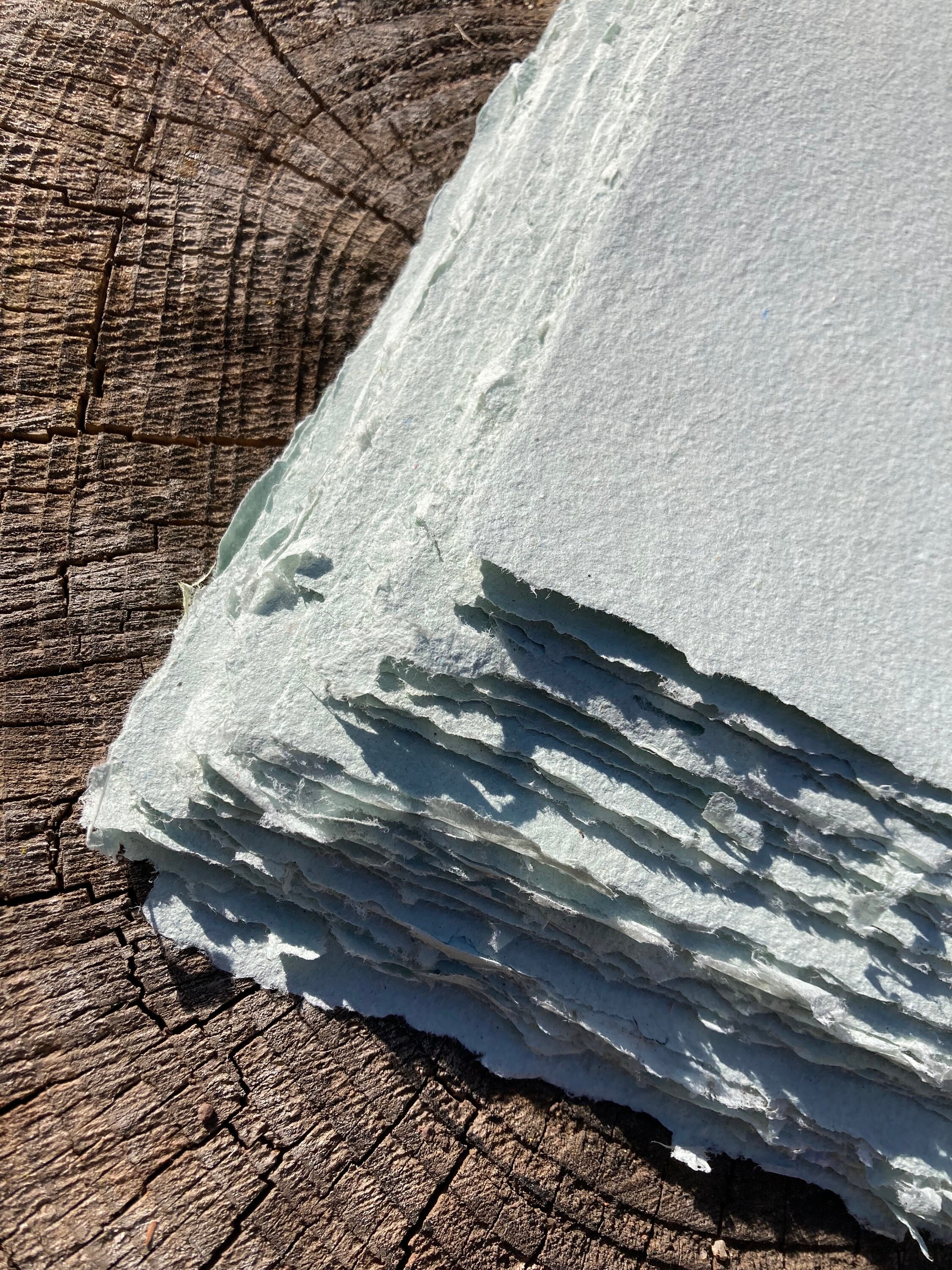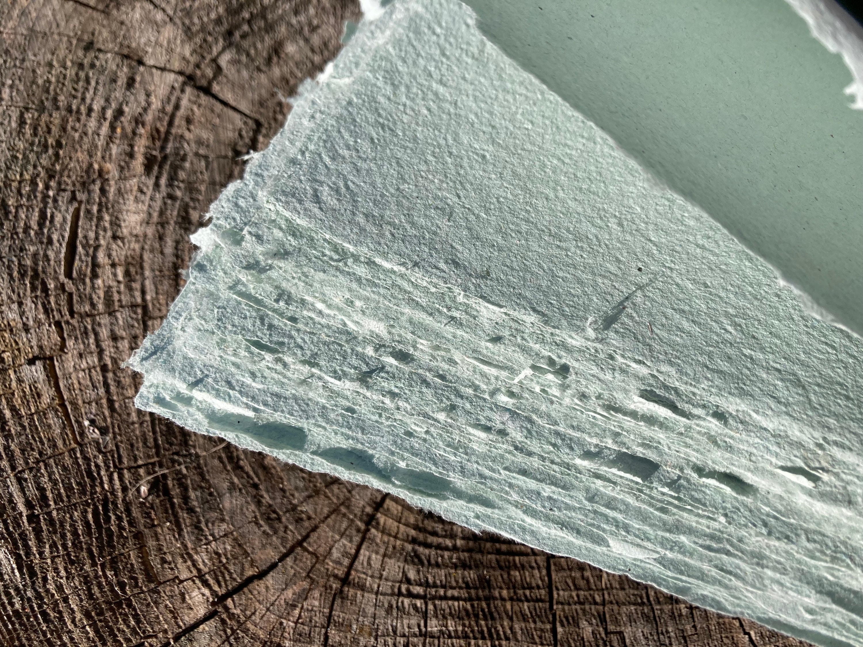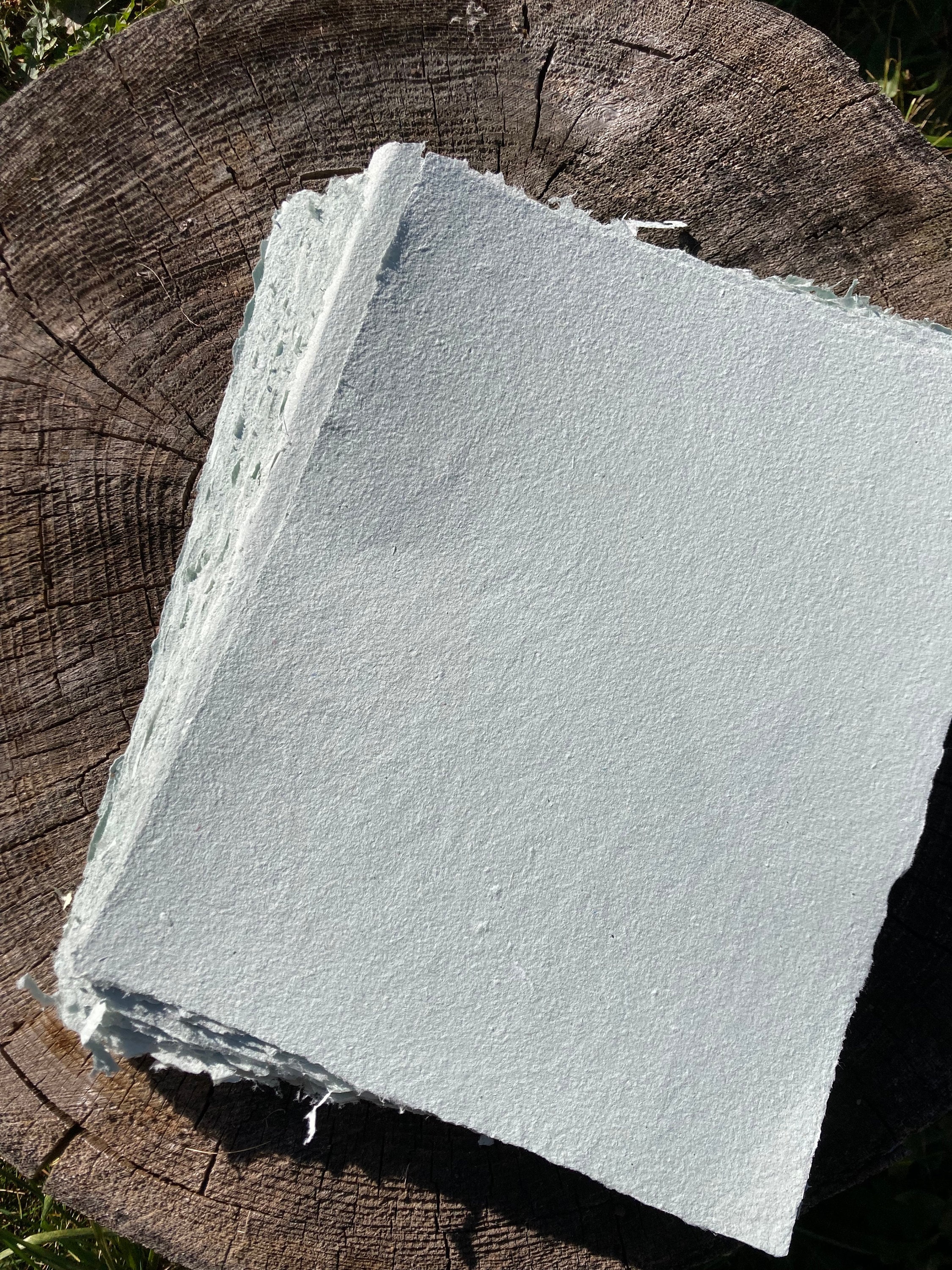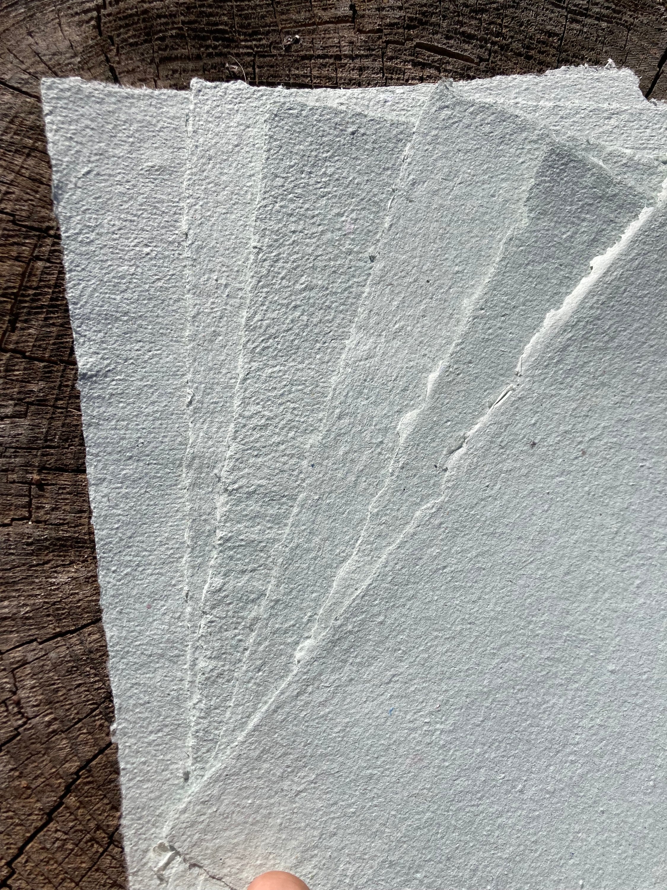 These sheets are much thinner than my usual watercolor paper, but are extra strong because they are made with recycled cotton fabric and commercial printmaking paper scraps. They are a pale sage and internally sized to handle wet media such as watercolor paint, intaglio printing, calligraphy, and more.
