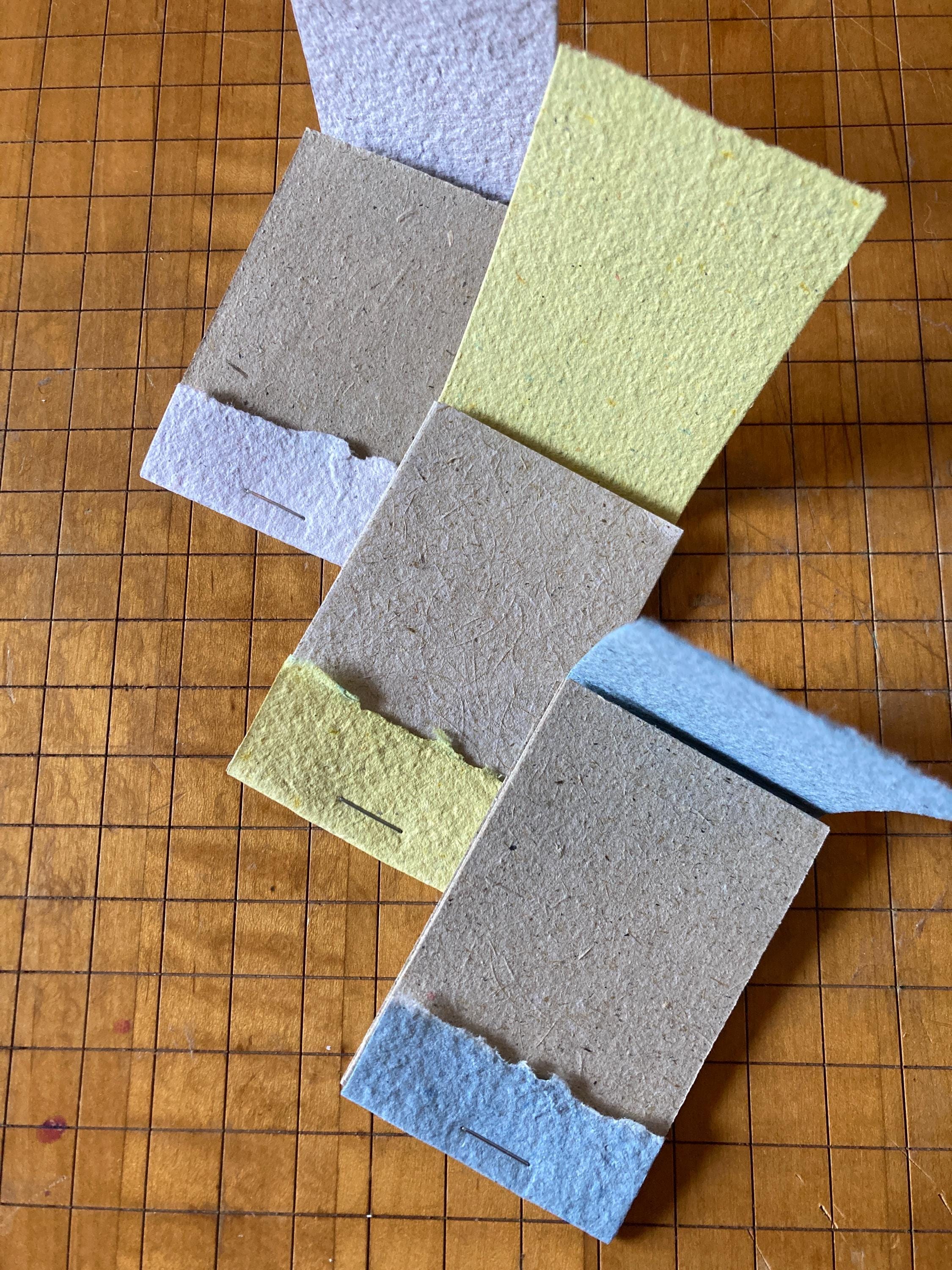 This listing is for a set of three 2x3 inch matchbook notebooks with assorted cover colors, and neutral pages made from mixed recycled materials and plant fibers from my garden, such as lily leaves, hosta, and lily of the valley.