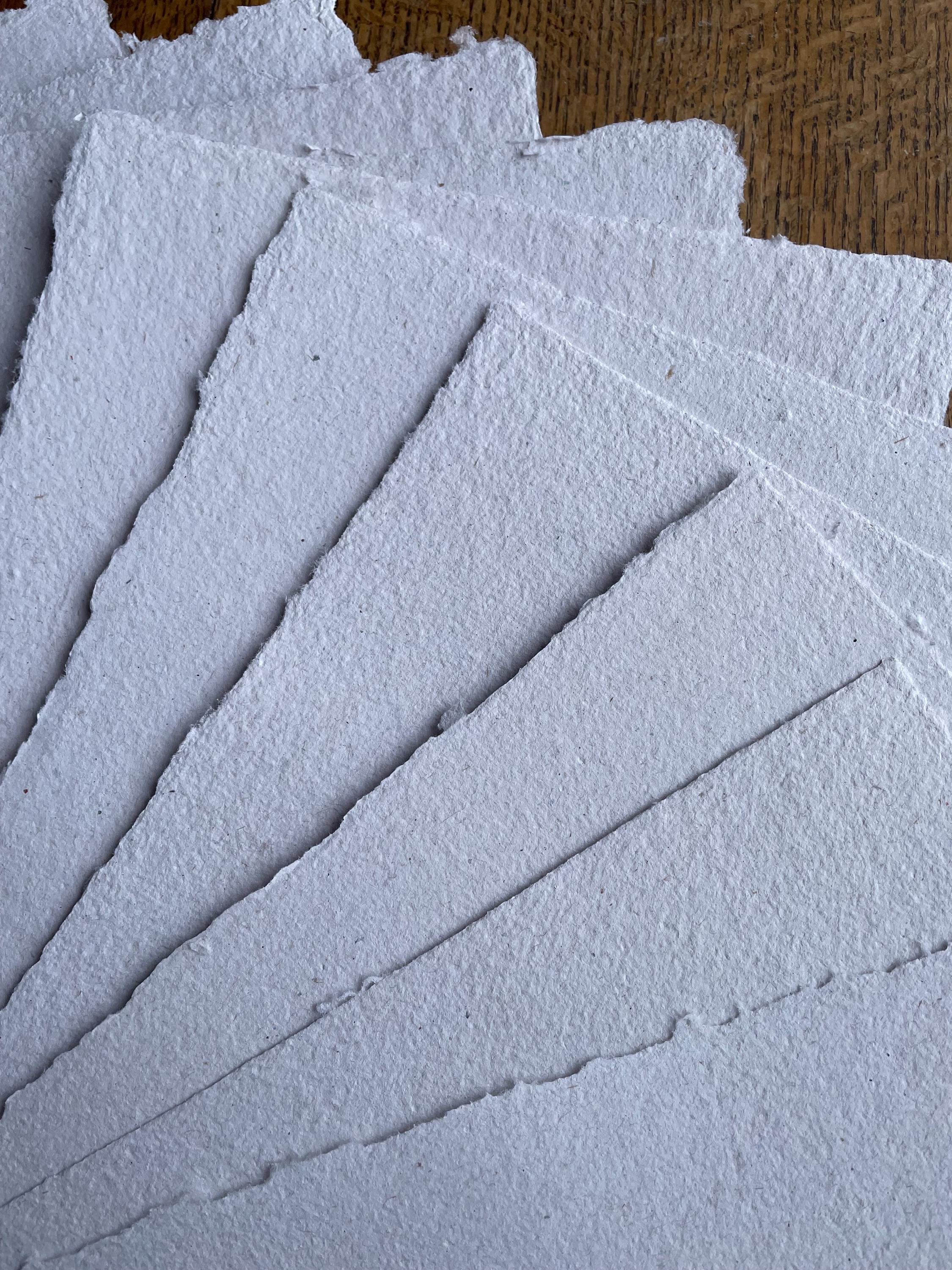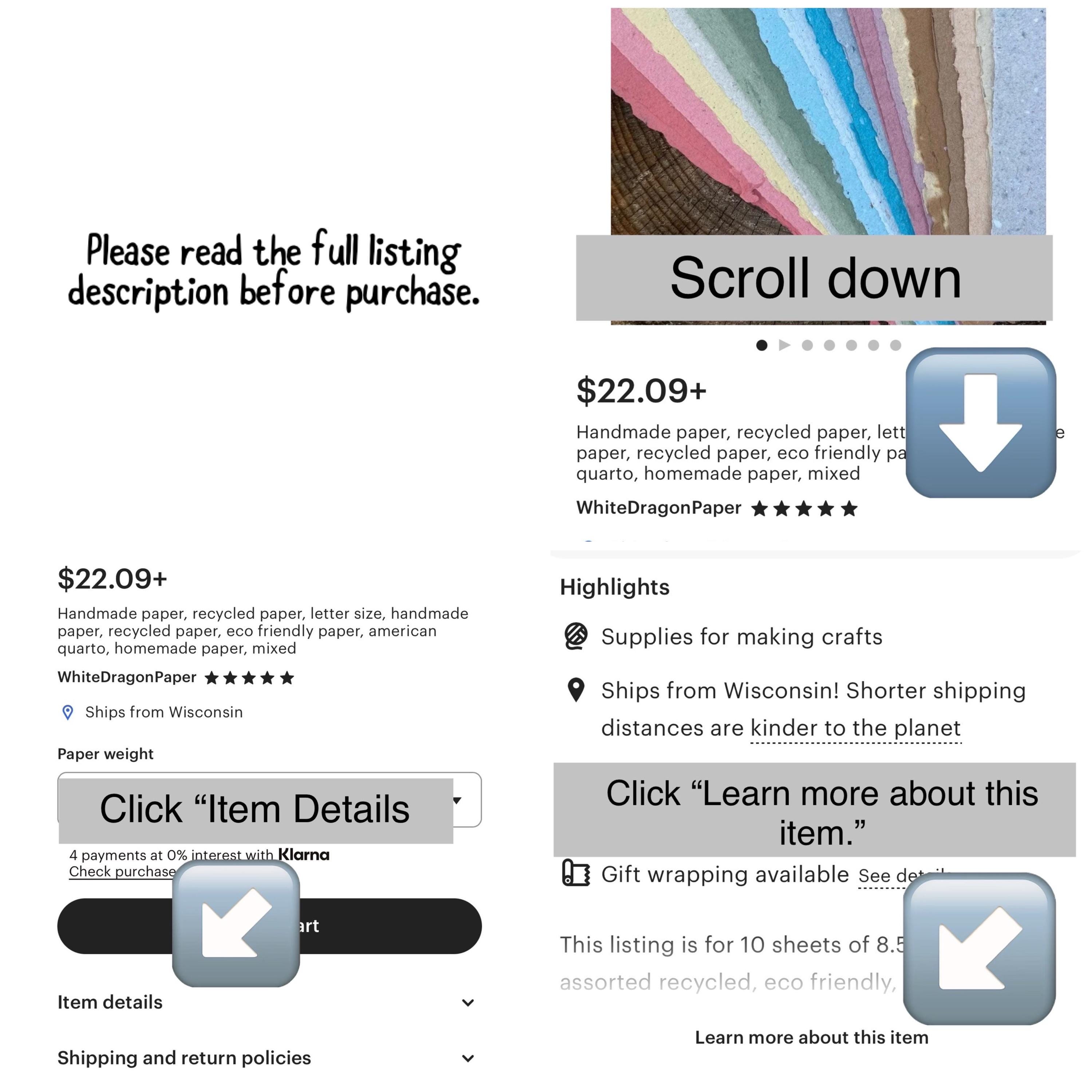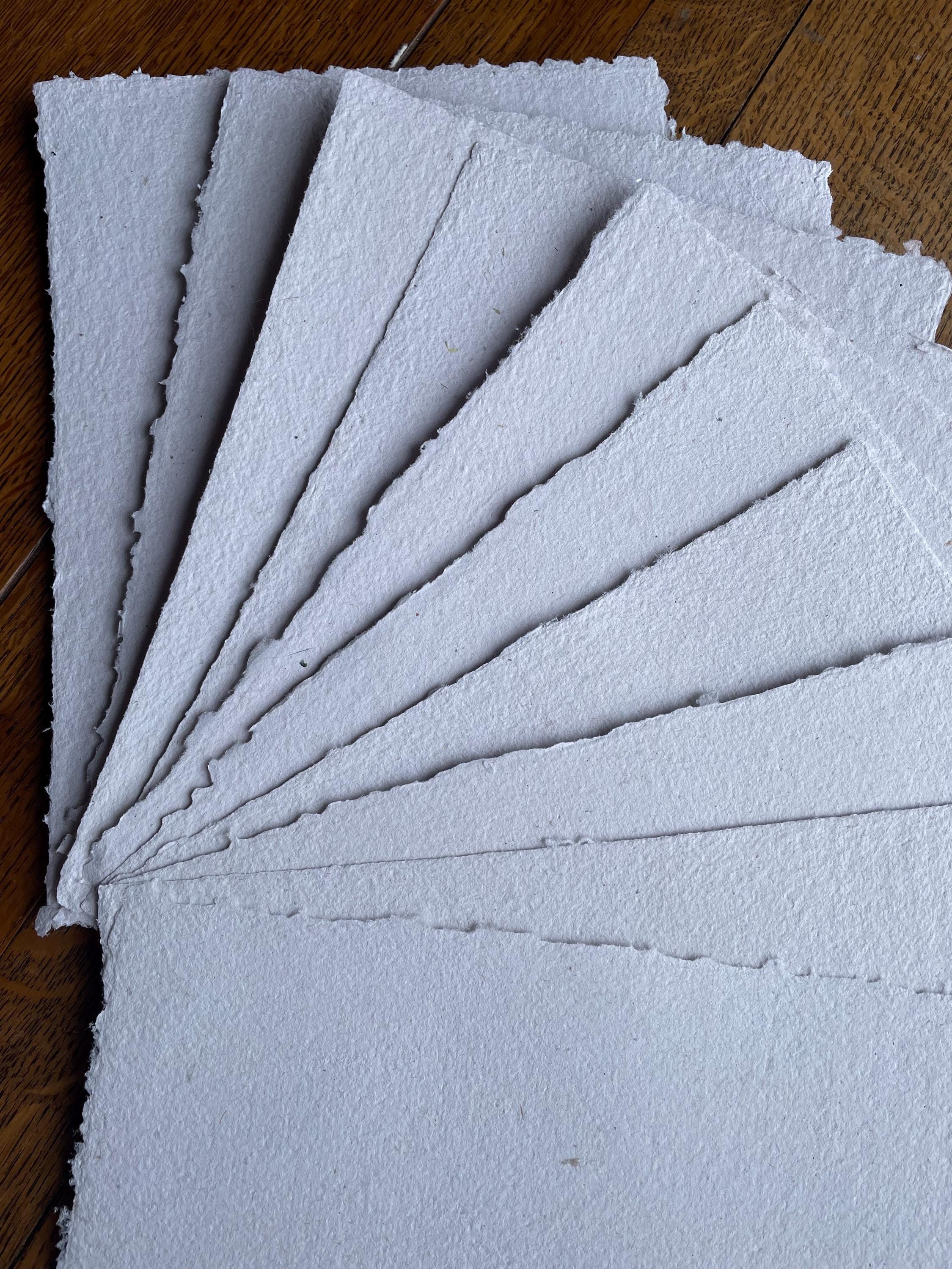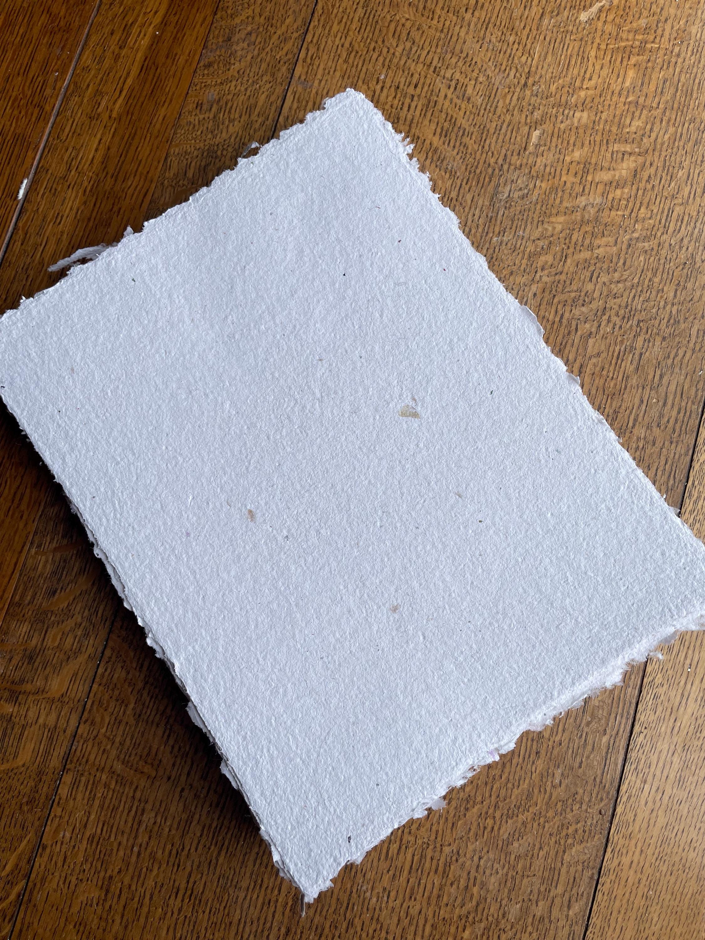 This listing is for one 8.5 x 11 inch sheet of vegan, recycled handmade paper, average 145gsm, made from recycled misprints from a local artist, and specially formulated to handle wet media such as watercolors, marbling, printmaking, and calligraphy. It also works well with letterpress printing and embossing. To order more than one sheet, just select multiple quantities from the drop down menu.