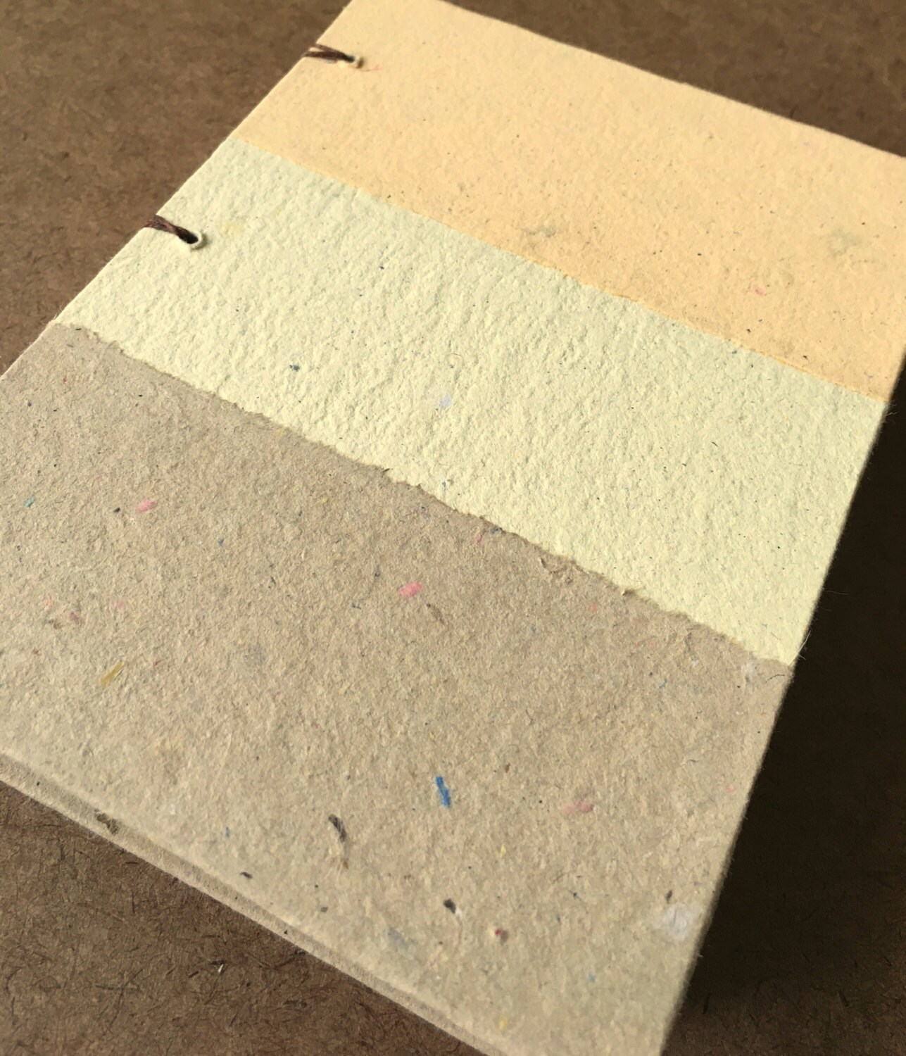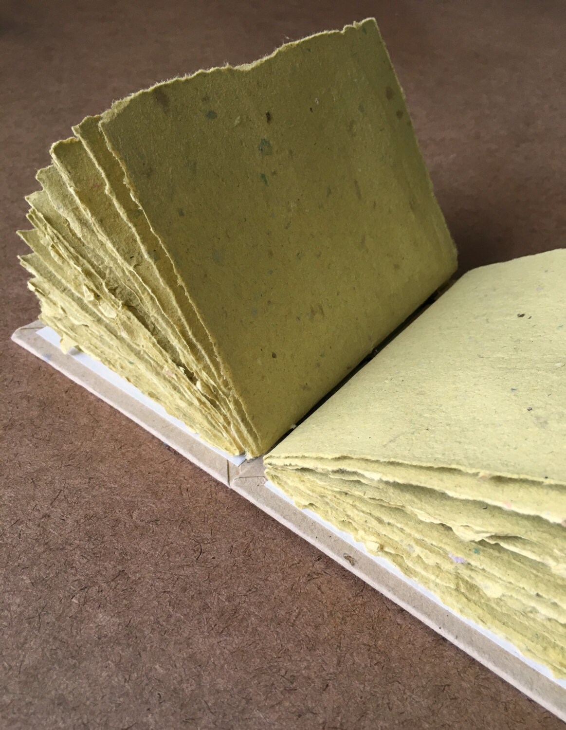 The cover was made by collaging scraps of handmade recycled paper in various shades of yellow leftover from other projects and batches of paper. I strive to waste as little as possible, so every bit of handmade paper is used or recycled into a new batch.