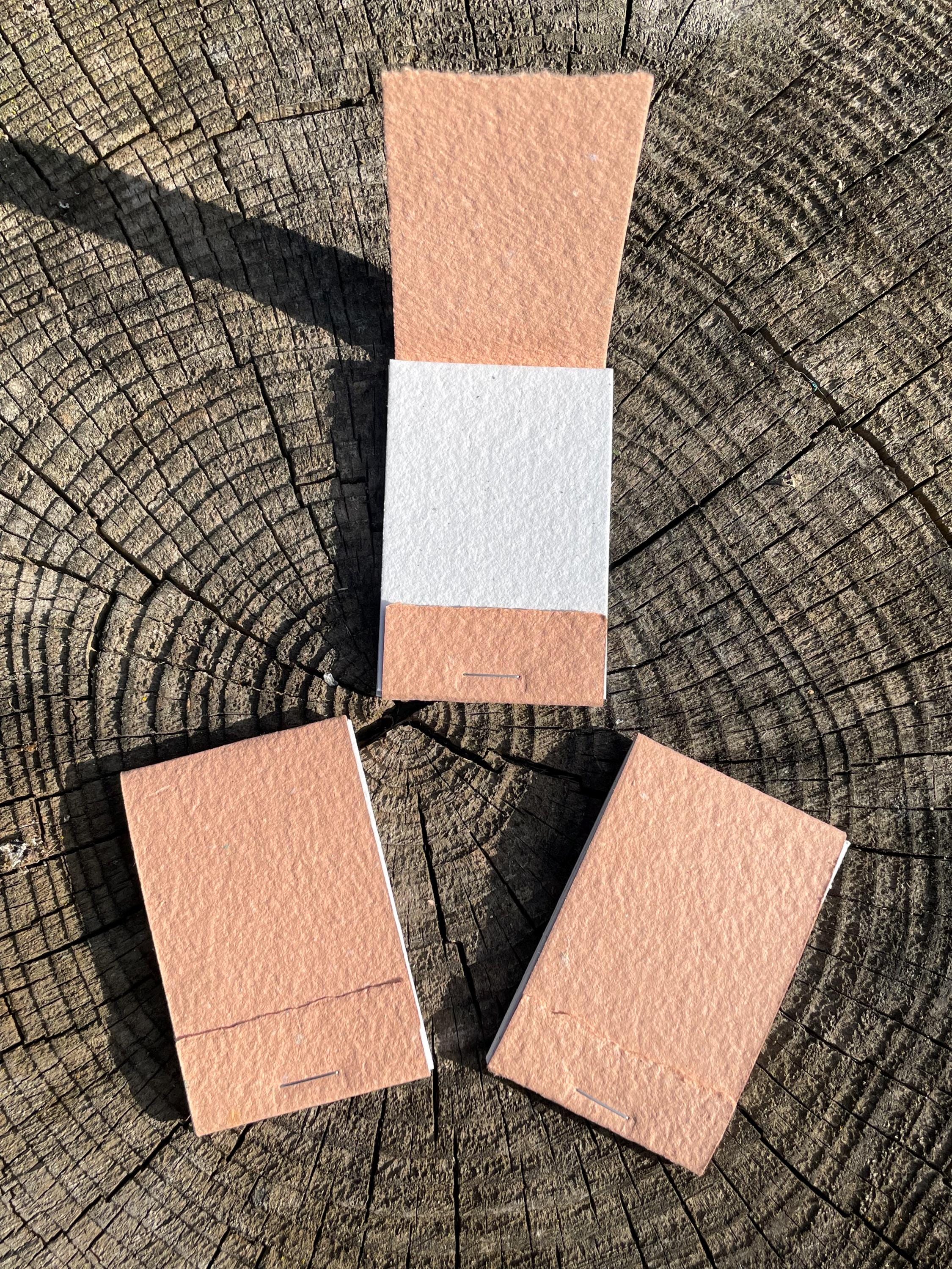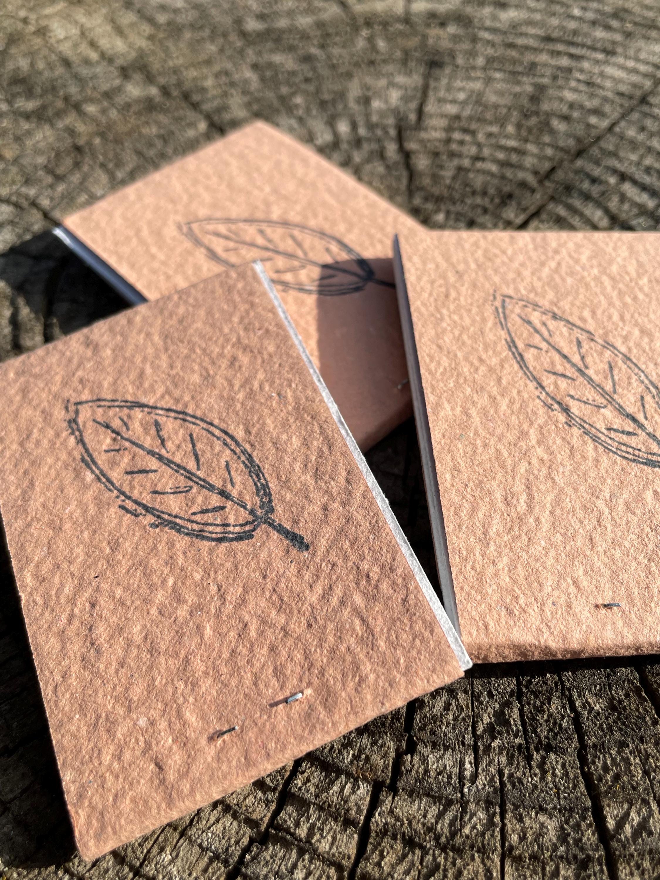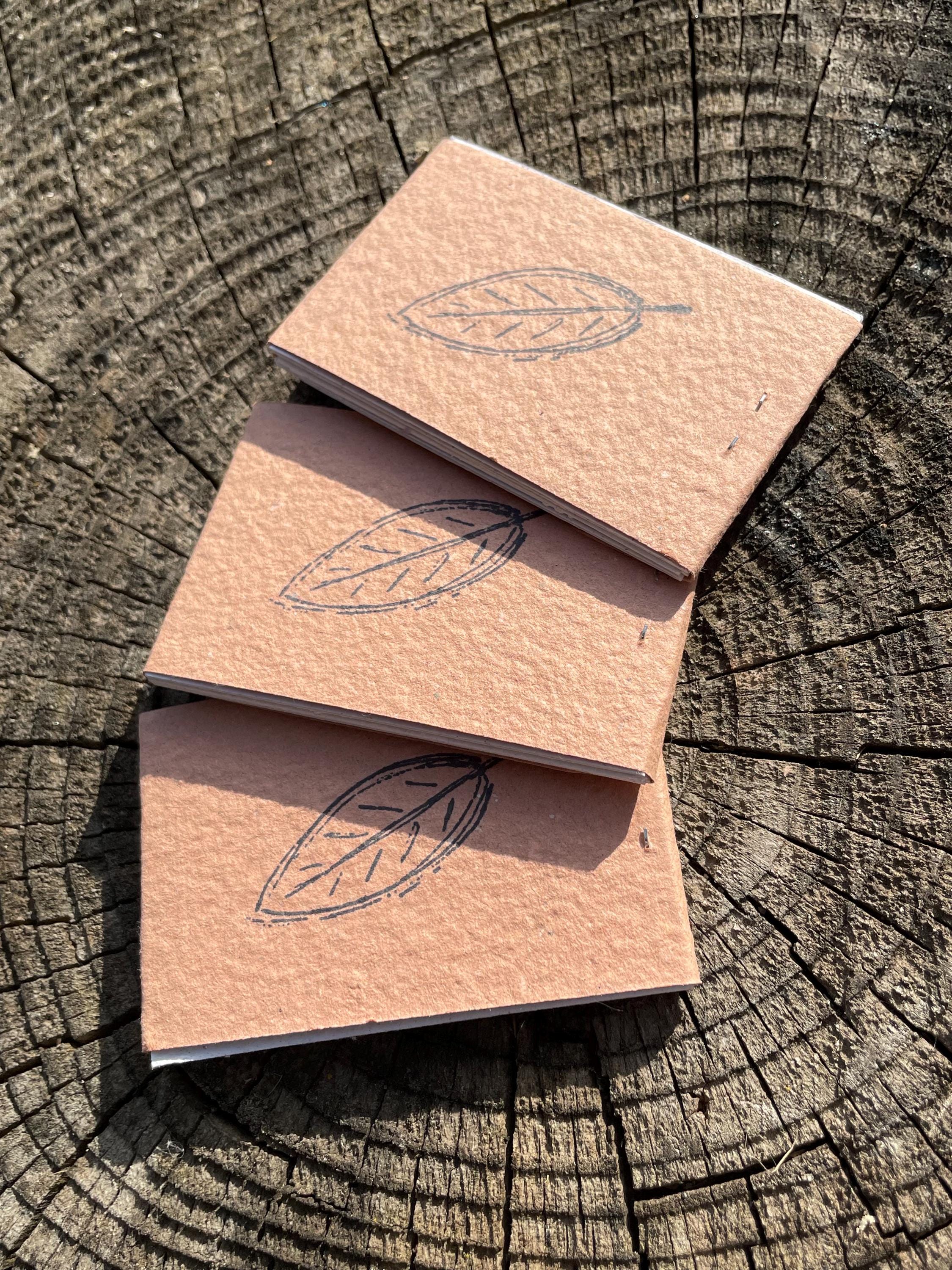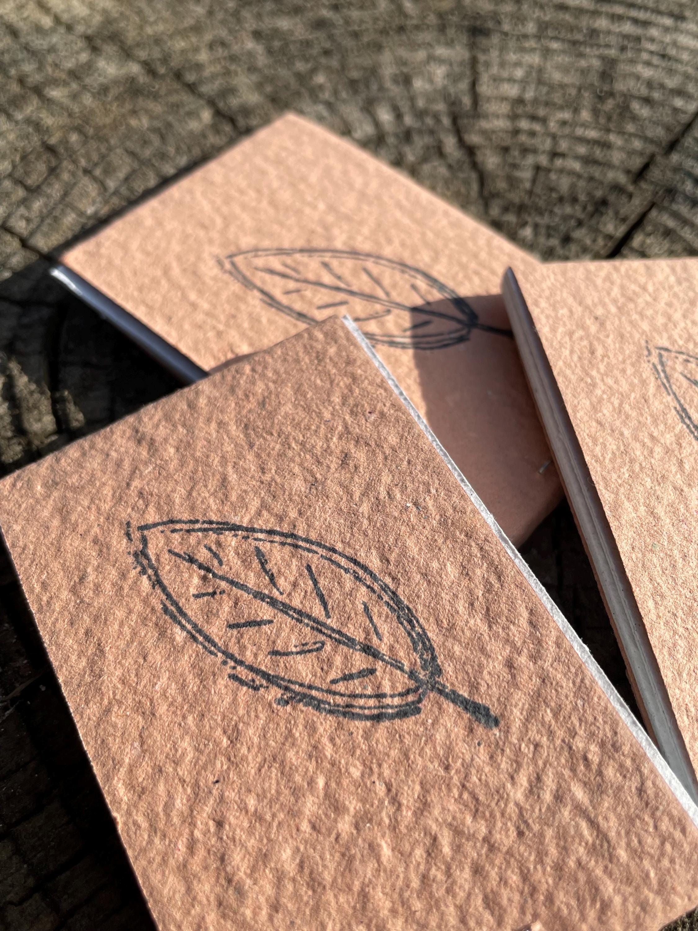 This listing is for a set of three orange 2x3 inch matchbook notebooks with white pages and a black leaf printed on the back cover.