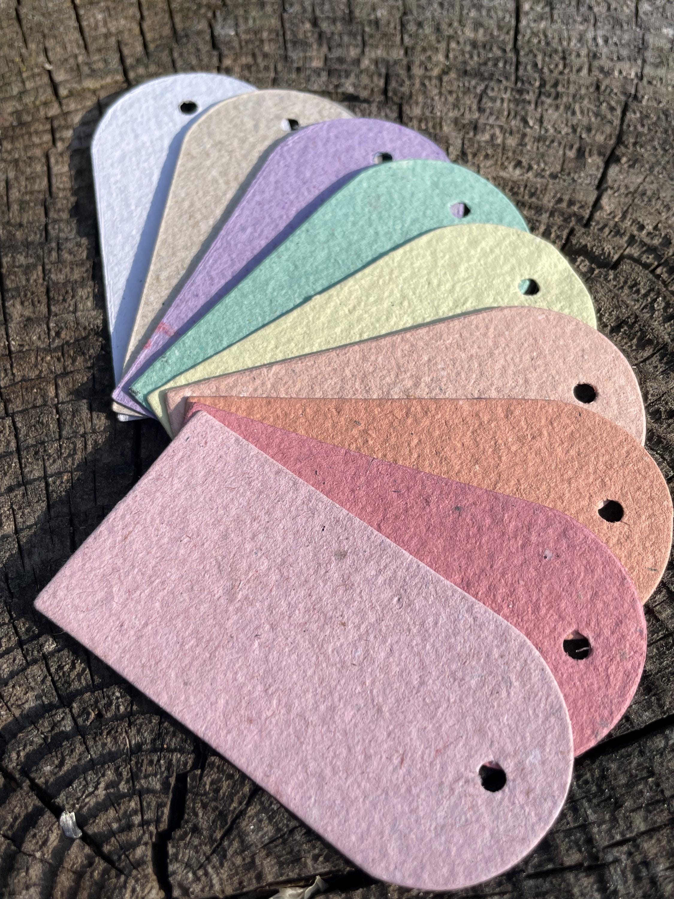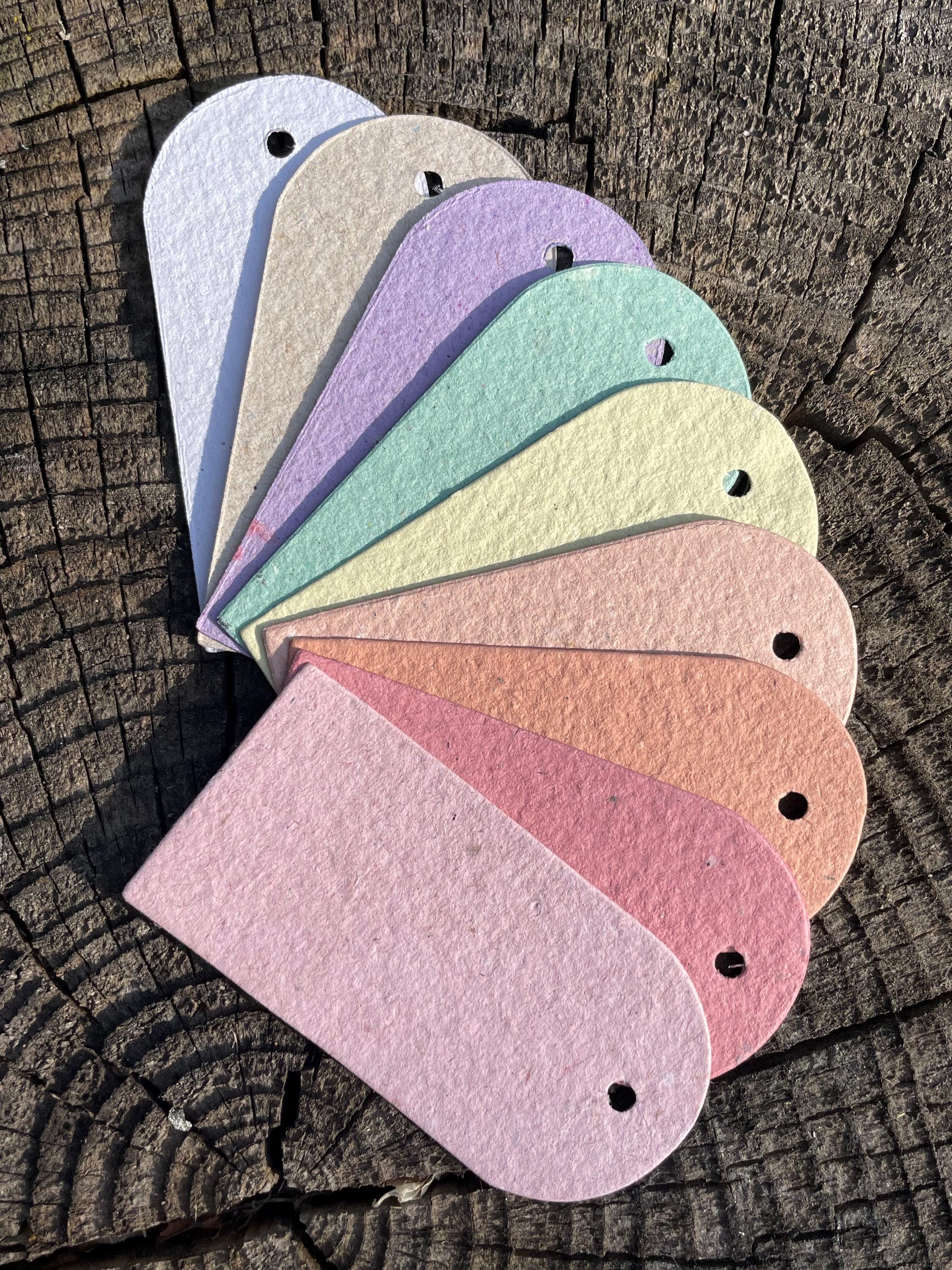This listing is for 10 tags cut from an assortment of handmade recycled paper, and white handmade recycled paper with colorful threads. You will receive the exact assortment shown.