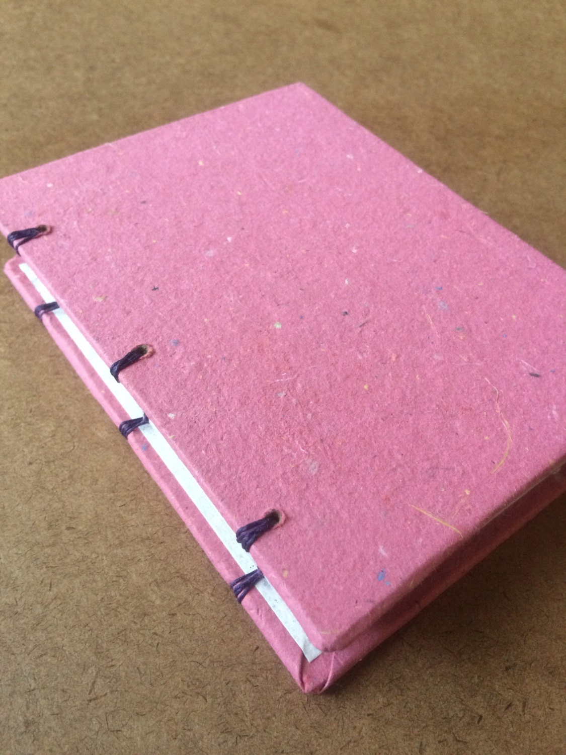 The cover was made by covering archival book board with red handmade recycled paper which was made by me in my studio. I strive to waste as little as possible, so every bit of handmade paper is used or recycled into a new batch.