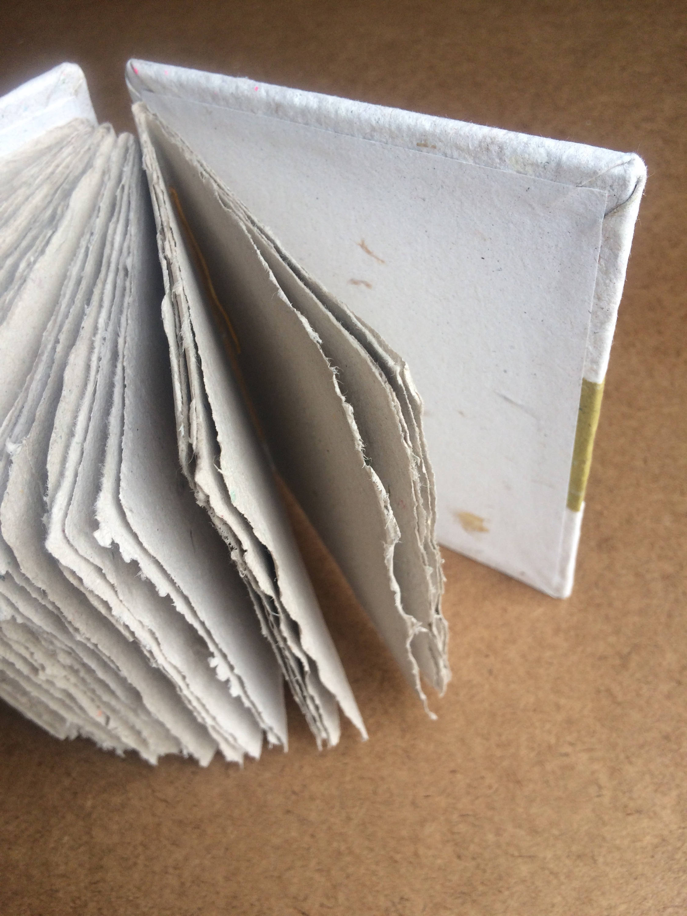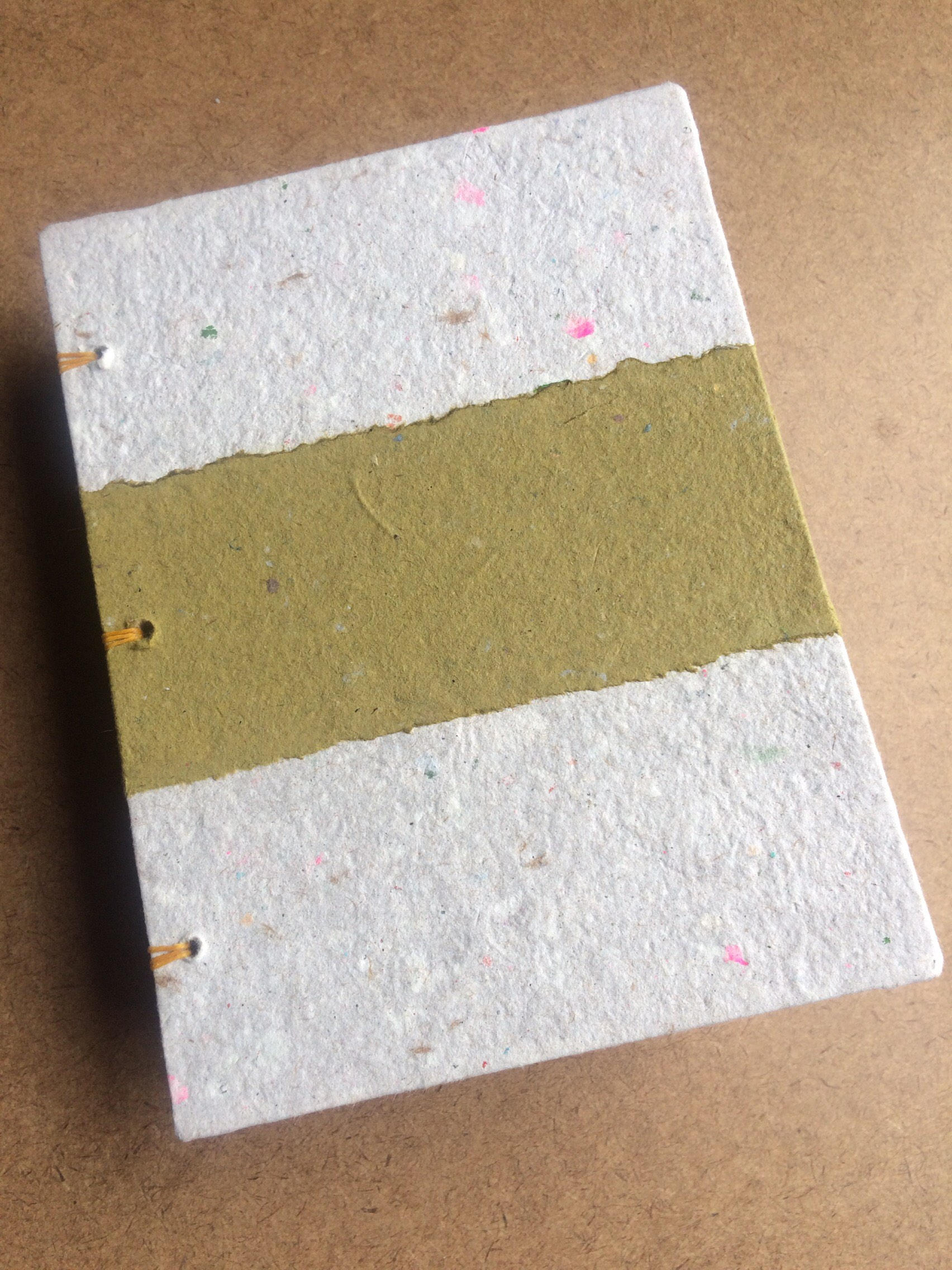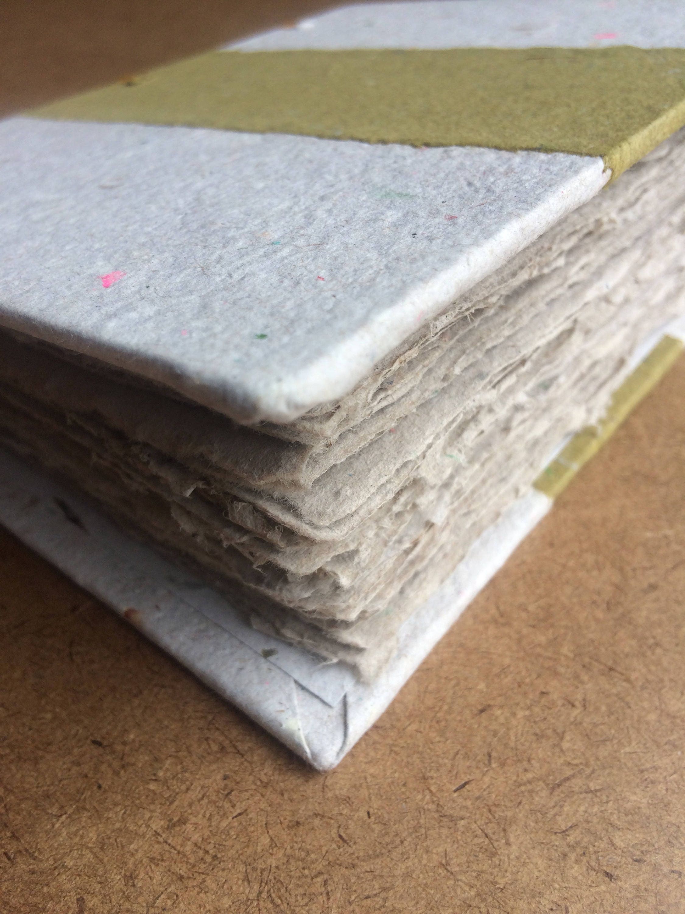 The cover was made by collaging scraps of handmade recycled paper leftover from other projects and batches of paper. I strive to waste as little as possible, so every bit of handmade paper is used or recycled into a new batch.