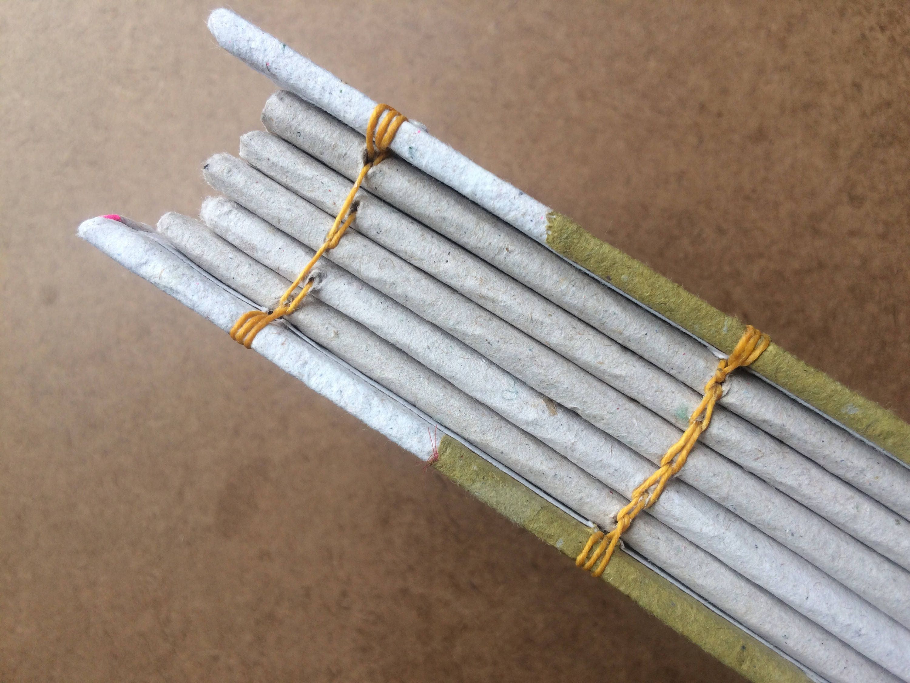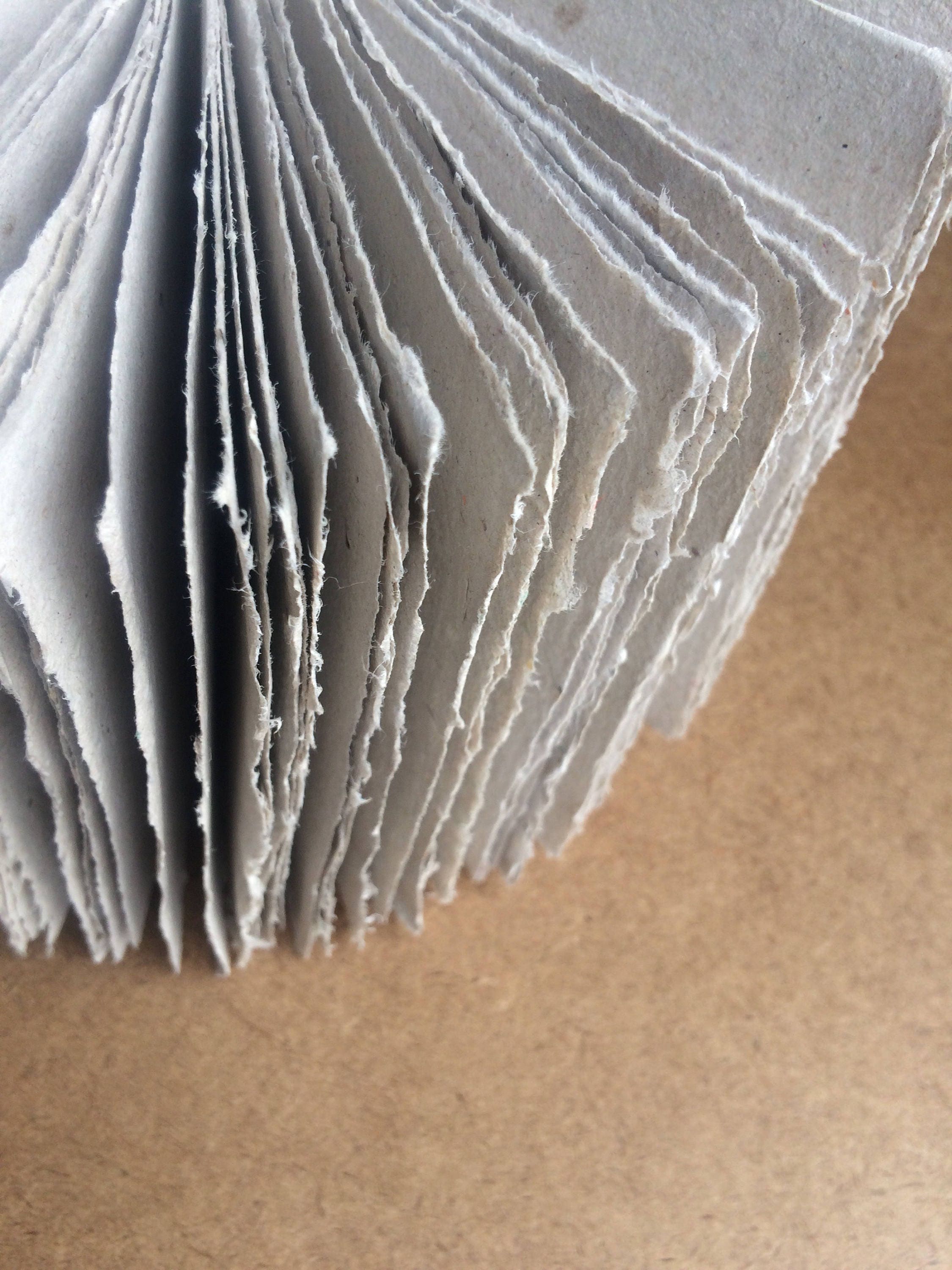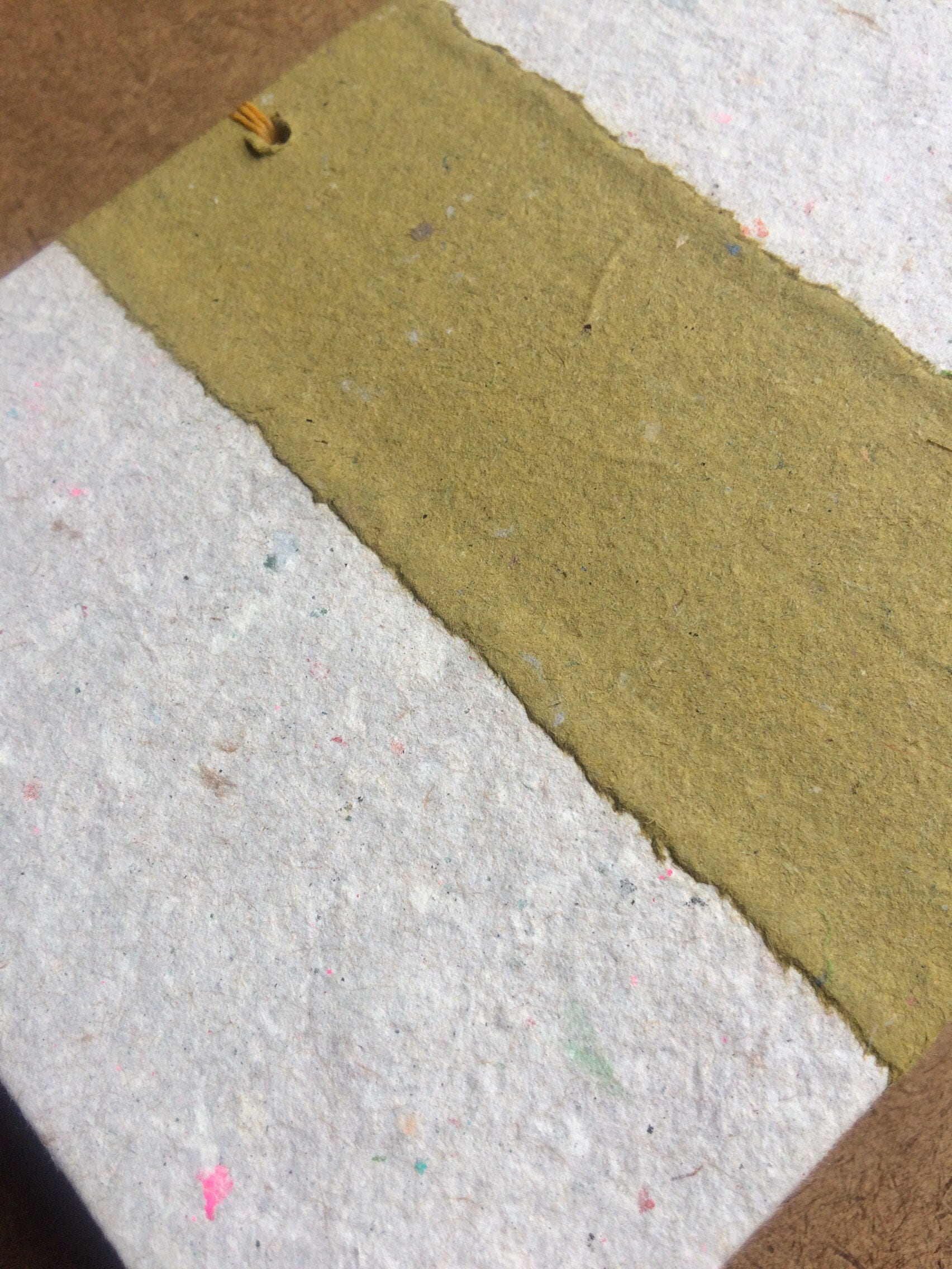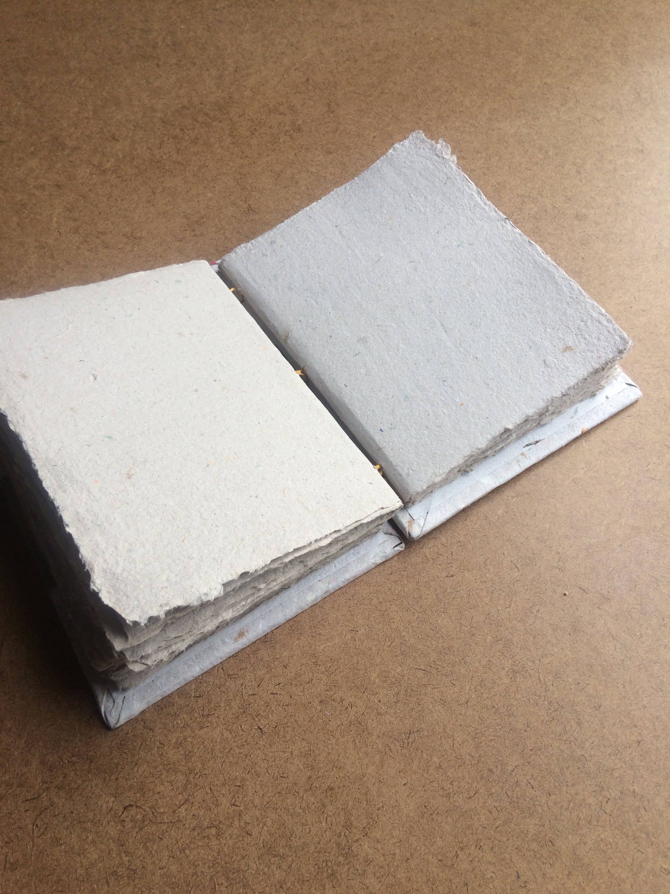 The cover was made by collaging scraps of handmade recycled paper leftover from other projects and batches of paper. I strive to waste as little as possible, so every bit of handmade paper is used or recycled into a new batch.