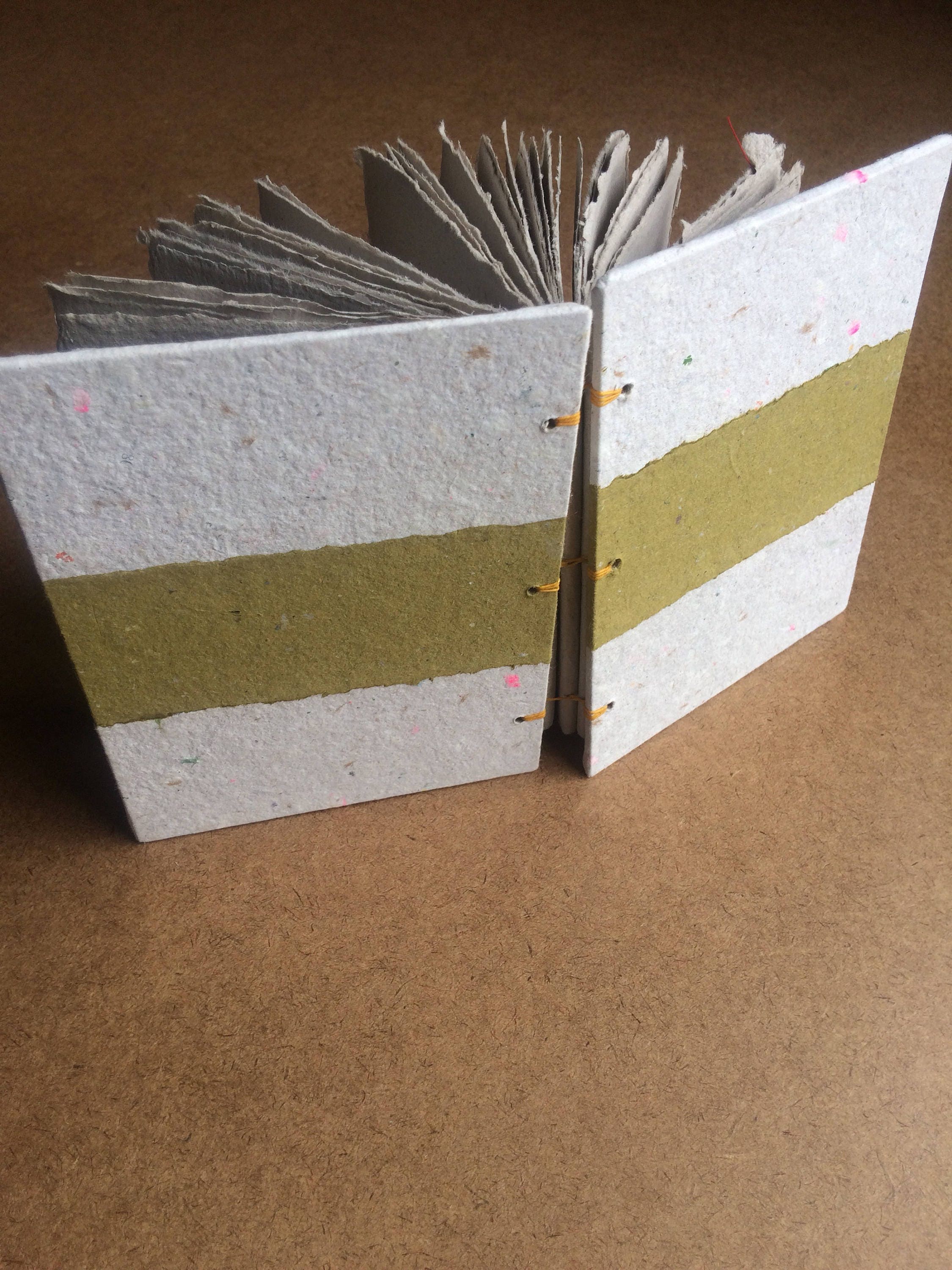This listing is for a handmade journal sewn in the coptic style with yellow waxed linen thread, which is durable and strong. The pages are my high quality handmade paper, which is made in house in Columbus, Ohio from recycled materials. The coptic binding of this journal allows the book to lay completely flat when open, creating its own flat surface for use away from a desk.