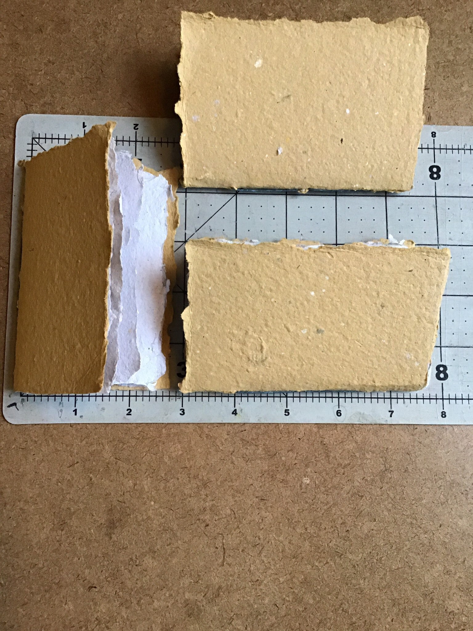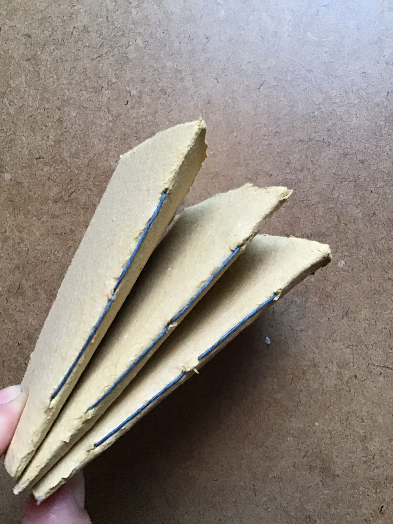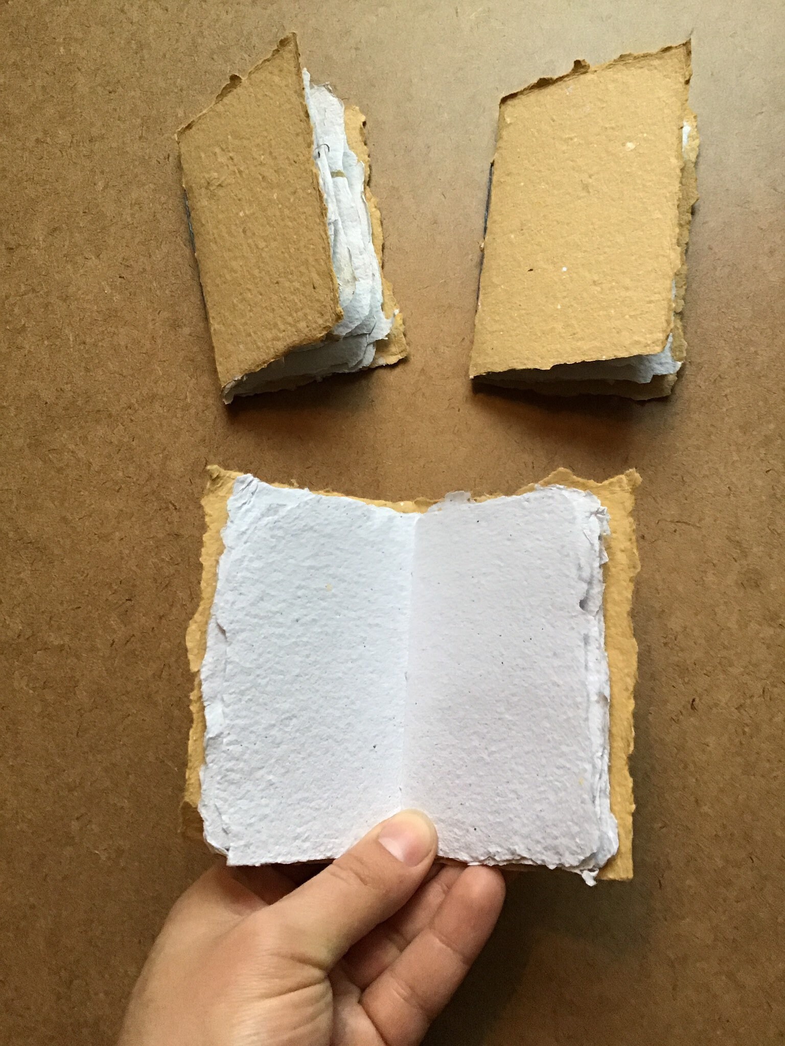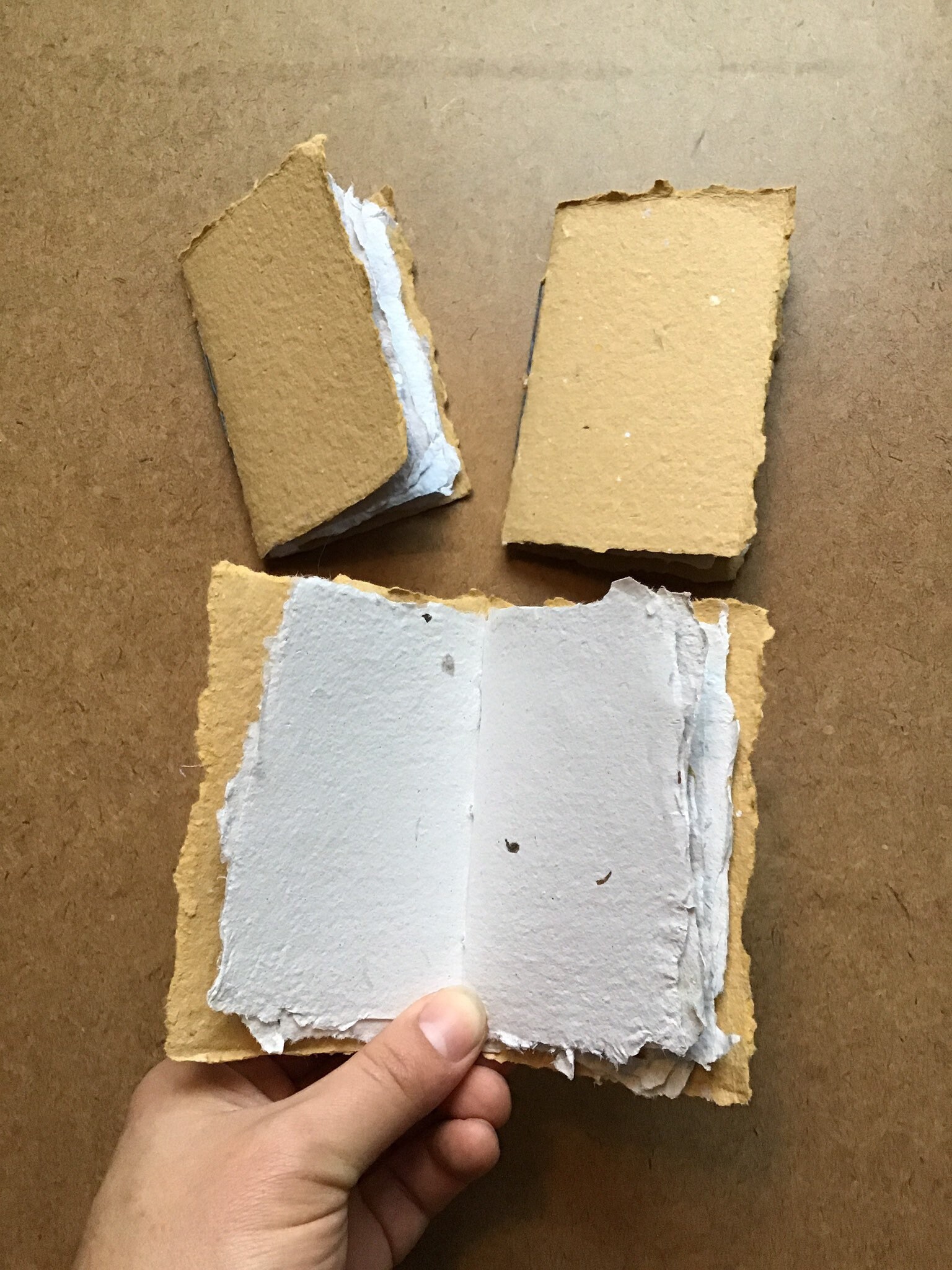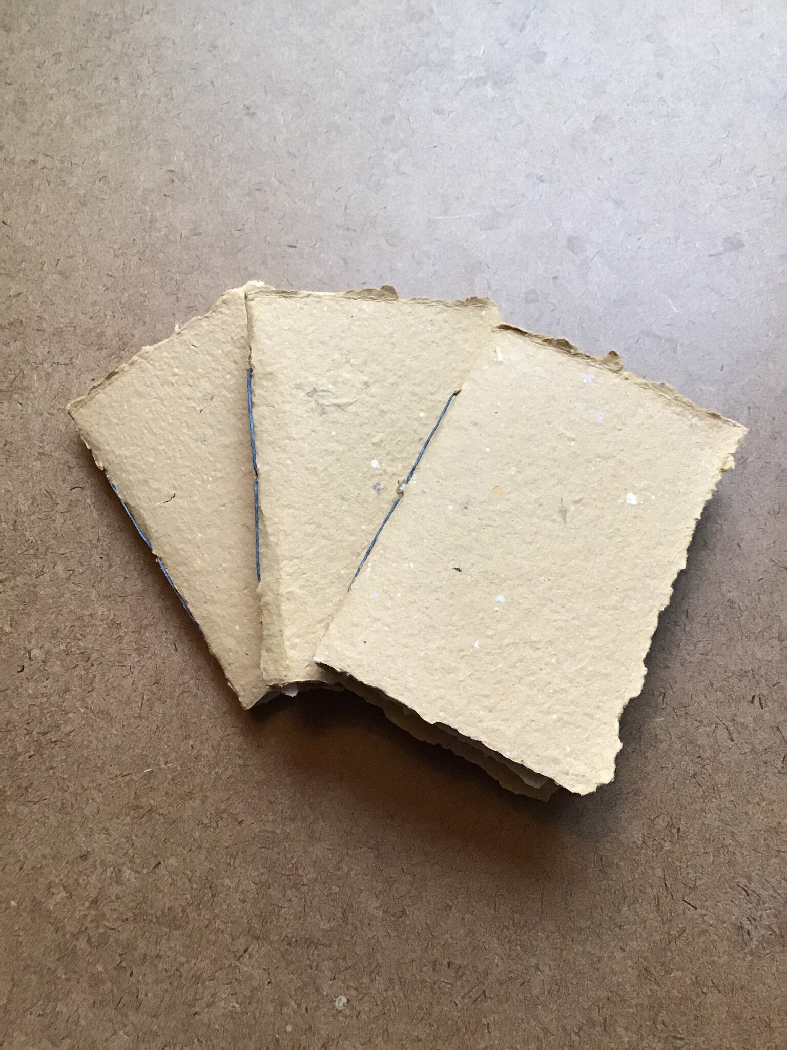 This listing is for a set of three 10 page (20 sides) notebooks measuring approximately 3x4.5 inches. These journals are made from a variety of recycled materials such as office paper, cardboard boxes, thread scraps, and flower petals left over from a friend’s floral subscription business.