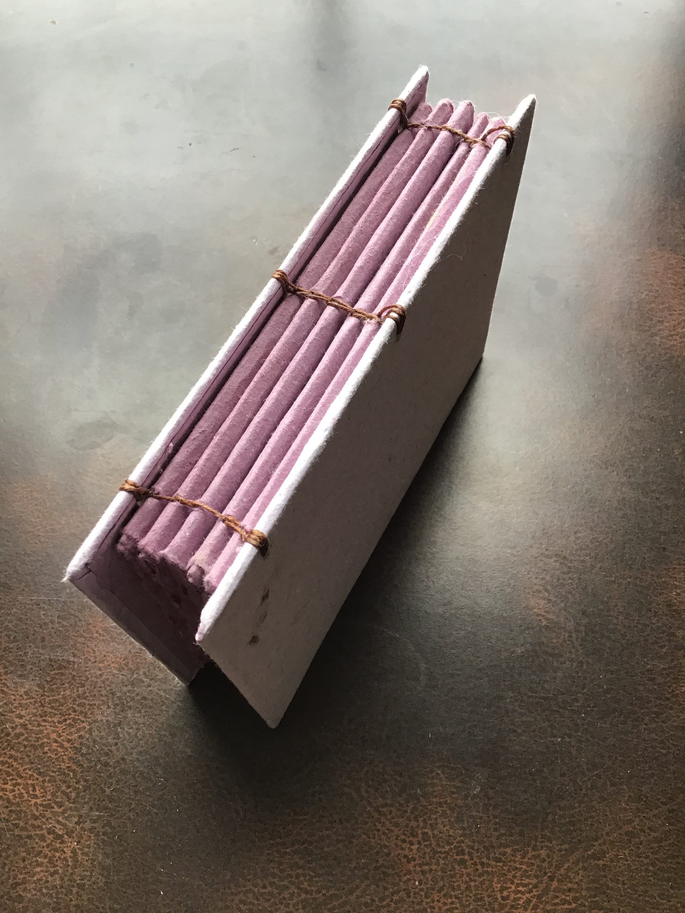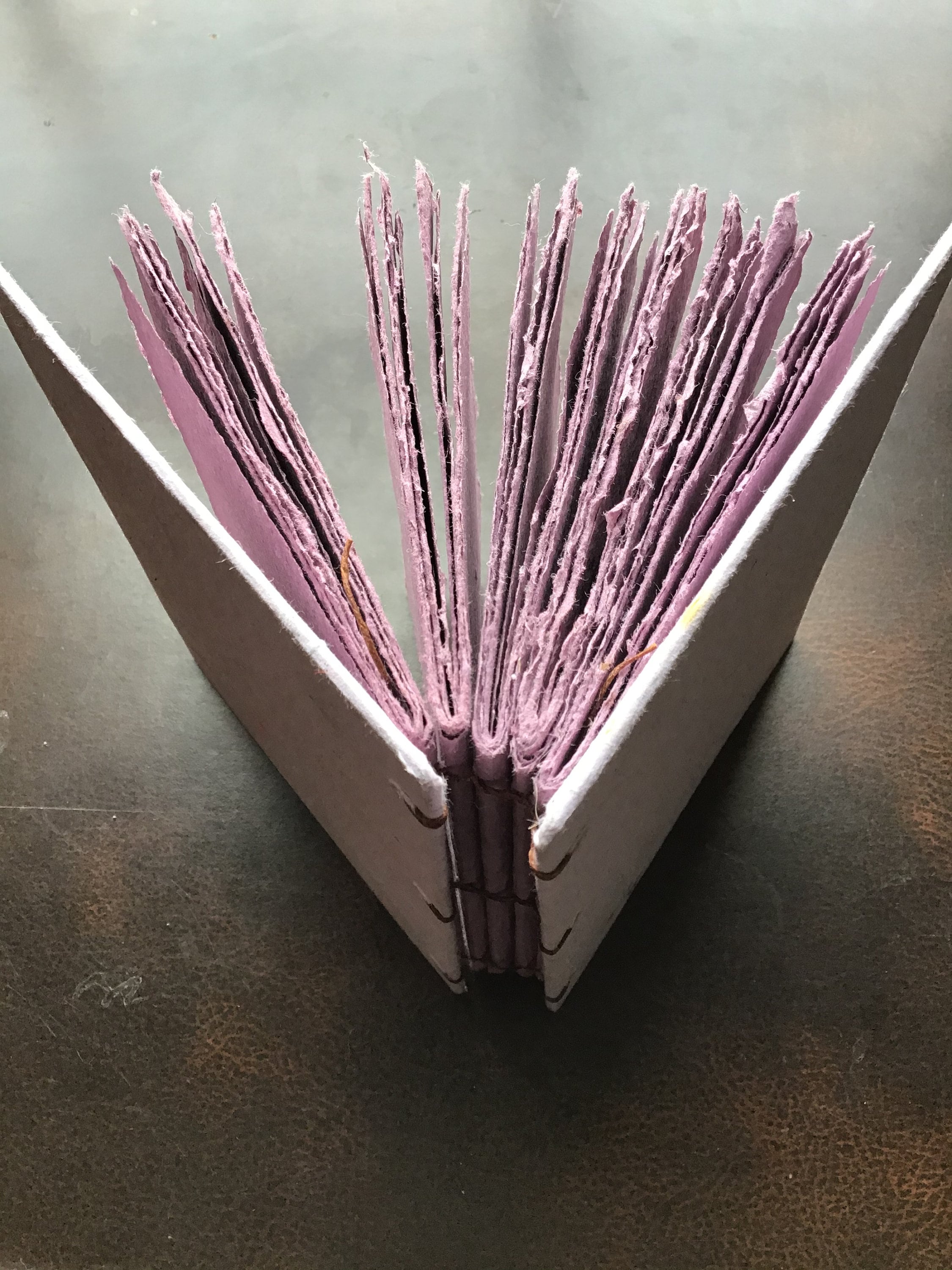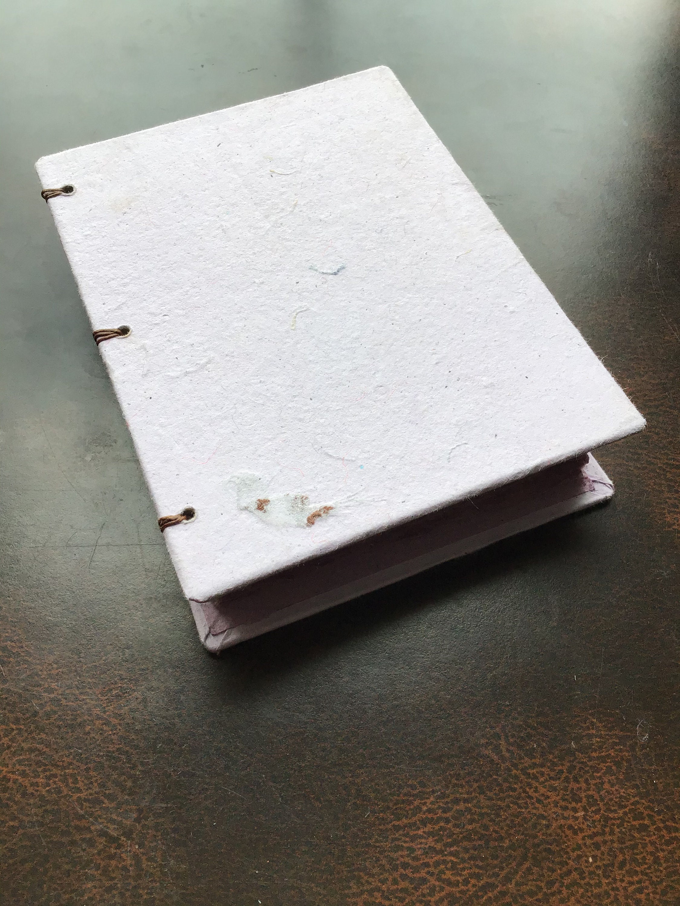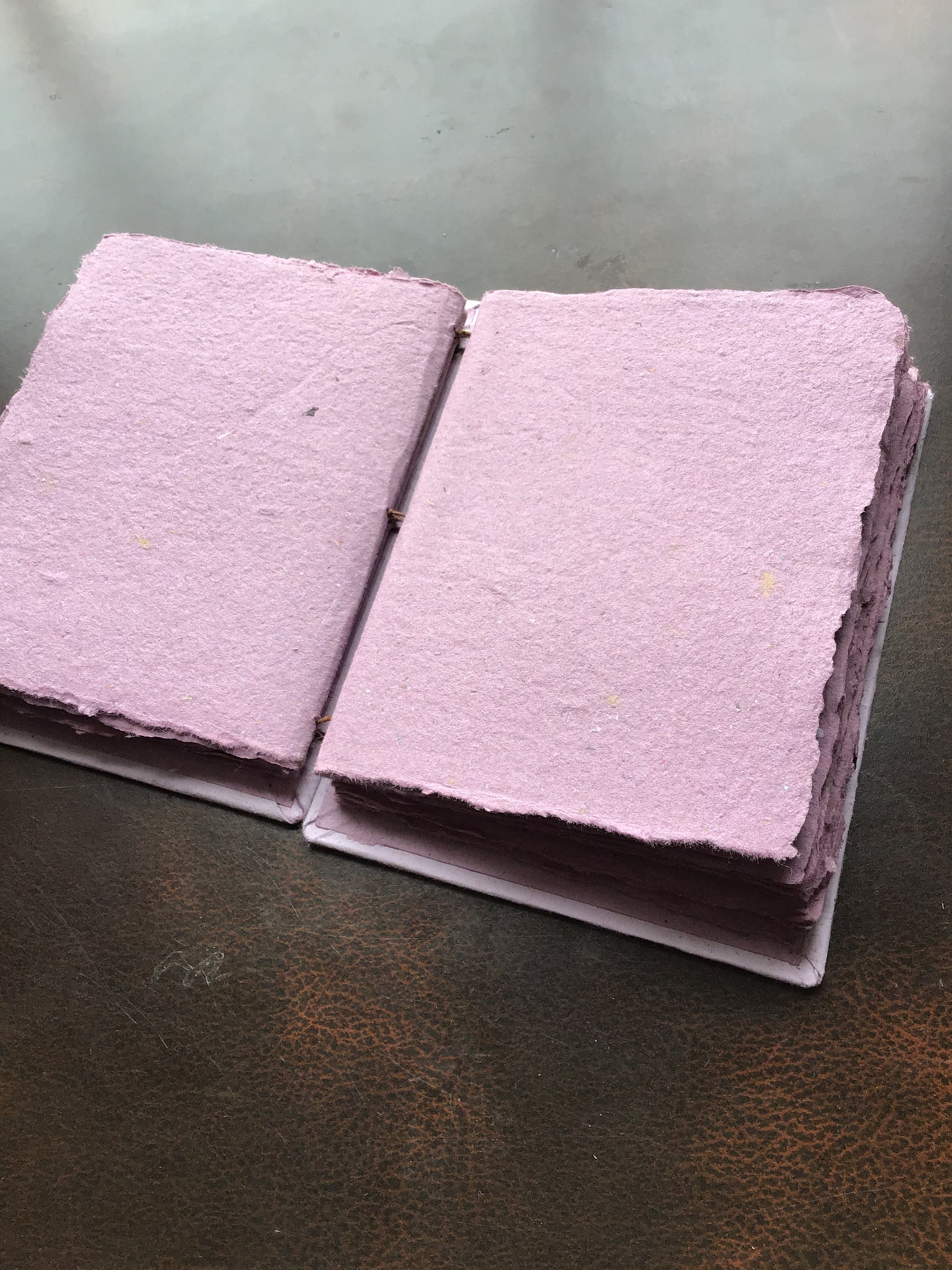 The cover was made by collaging handmade recycled paper leftover from other projects and batches of paper. I strive to waste as little as possible, so every bit of handmade paper is used or recycled into a new batch.